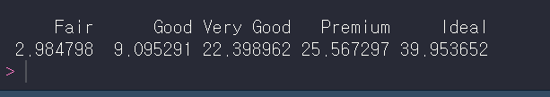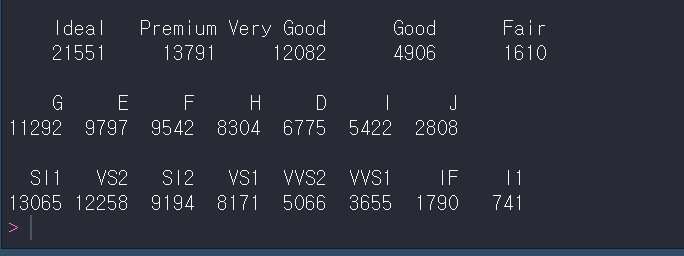 데이터의 빈도를 나타내주기 때문에 위의 결과는 다이아몬드 데이터에서 cut 속성에 대해 fair가 1610개, good이 4906개 등으로 설명할 수 있어요!