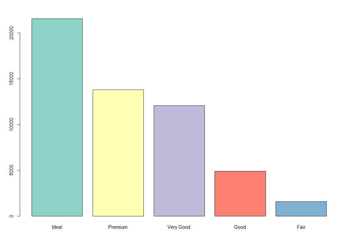 pal <- RColorBrewer::brewer.pal(n = 5, name = "Set3") barplot(sort(table(diamonds$cut) , decreasing = TRUE), col=pal)