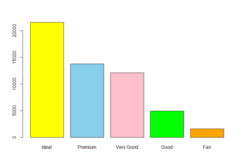 barplot(sort(table(diamonds$cut) , decreasing = TRUE), col=c("yellow", "skyblue", "pink","green","orange"))