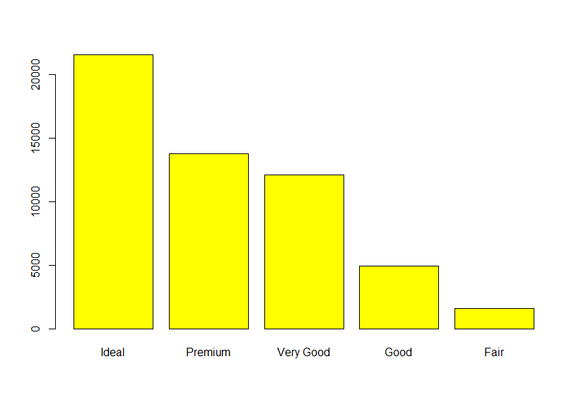 barplot(sort(table(diamonds$cut) , decreasing = TRUE), col="yellow") -> 막대 컬러 설정